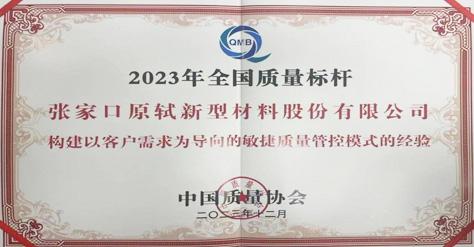 2023年12月,張家口原軾新型材料股份有限公司憑借 “構(gòu)建以客戶(hù)需求為導(dǎo)向的敏捷質(zhì)量管控模式的經(jīng)驗(yàn)”,榮獲2023年全國(guó)質(zhì)量標(biāo)桿企業(yè)。